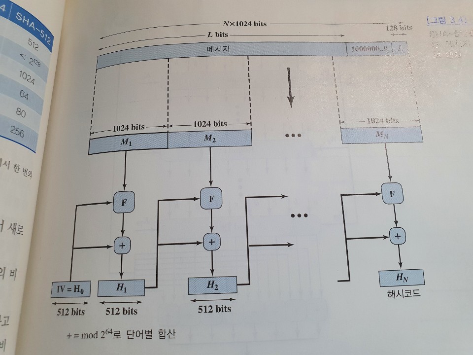 - 이 메시지를 1024개의 비트 블록으로 쪼개면 M_1, M_2, M_3,...., M_N이 된다.