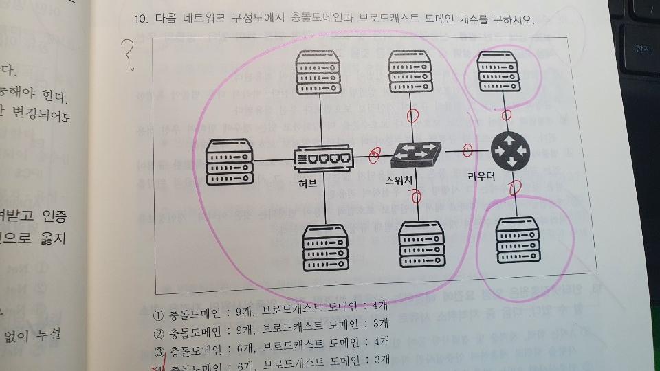 o 따라서 아래 문제에서 충돌 도메인은 빨간색으로 표시한 부분 6개, 브로드캐스트 도메인은 보라색으로 표시한 부분 4개가 정답이다.